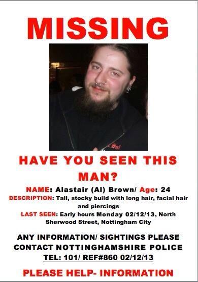 Alastair (Al) Brown, who is 24 years old, has been missing for more than three days and was last seen in the early hours of Monday, December 2nd on North Sherwood Street in Nottingham City.