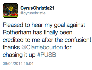 The goal was originally credited by some outlets to midfielder Franck Moussa, despite being nowhere near the ball, and as an own-goal by others, however Christie was adamant it was his.