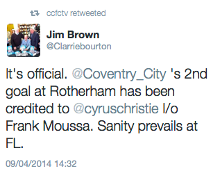 Coventry City defender Cyrus Christie has finally been awarded with the second goal in the 3-1 away victory at Rotherham United on New Year’s Day.