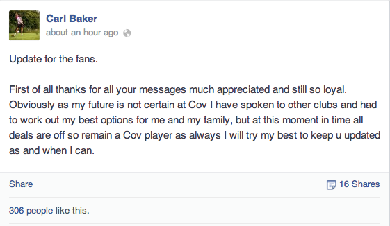 “First of all thanks for all your messages much appreciated and still so loyal. Obviously as my future is not certain at Cov I have spoken to other clubs and had to work out my best options for me and my family, but at this moment in time all deals are off so remain a Cov player as always I will try my best to keep u updated as and when I can.”