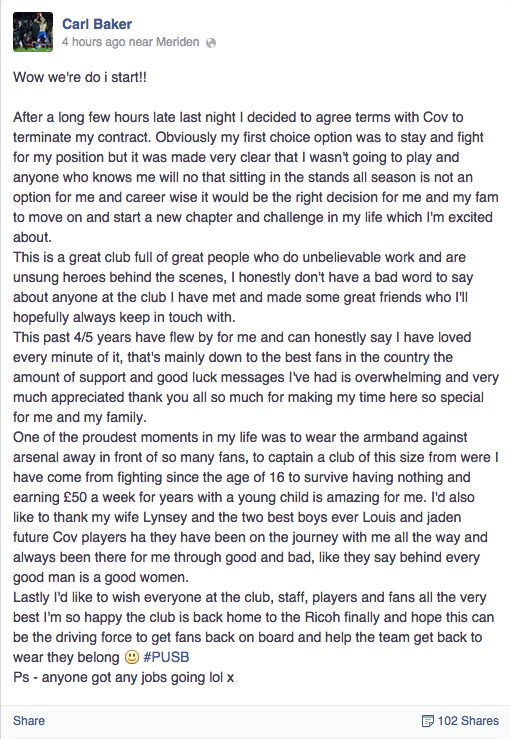 Former Coventry City captain Carl Baker has taken to his personal Facebook page to thank the supporters of Coventry City for their support during his four-and-a-half years with The Sky Blues. (Click on the image on the right, to see full size.)