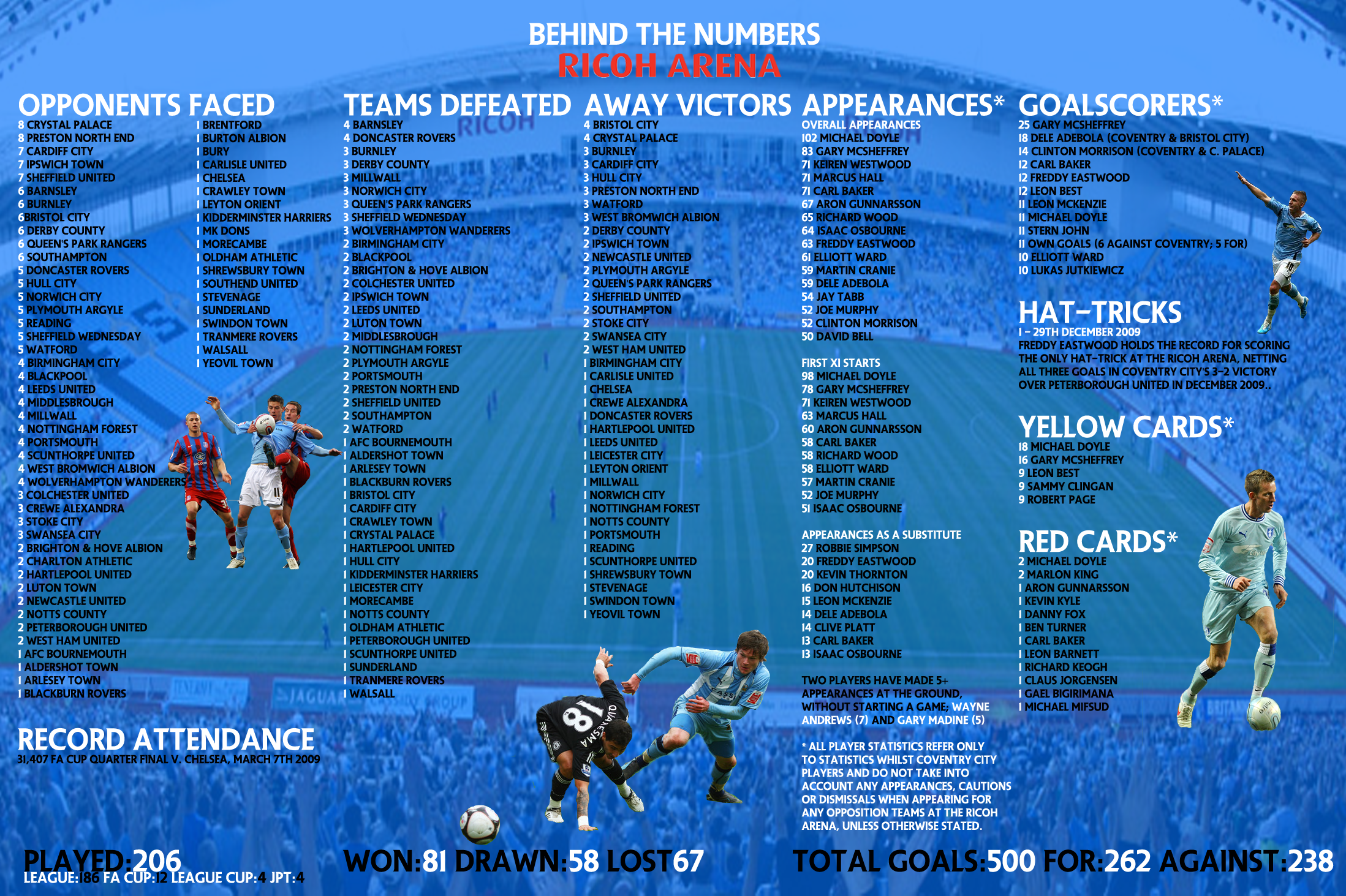 Michael Doyle made the most appearances for Coventry at the ground with 102 (49.5% of the total 206 games), despite spending a season on loan at Leeds United. 98 of the 102 appearances were in the starting XI. Robbie Simpson has the honour of being the most used substitute, taking to the field 27 times from the bench (69.2% of his 39 appearances at the ground.)
