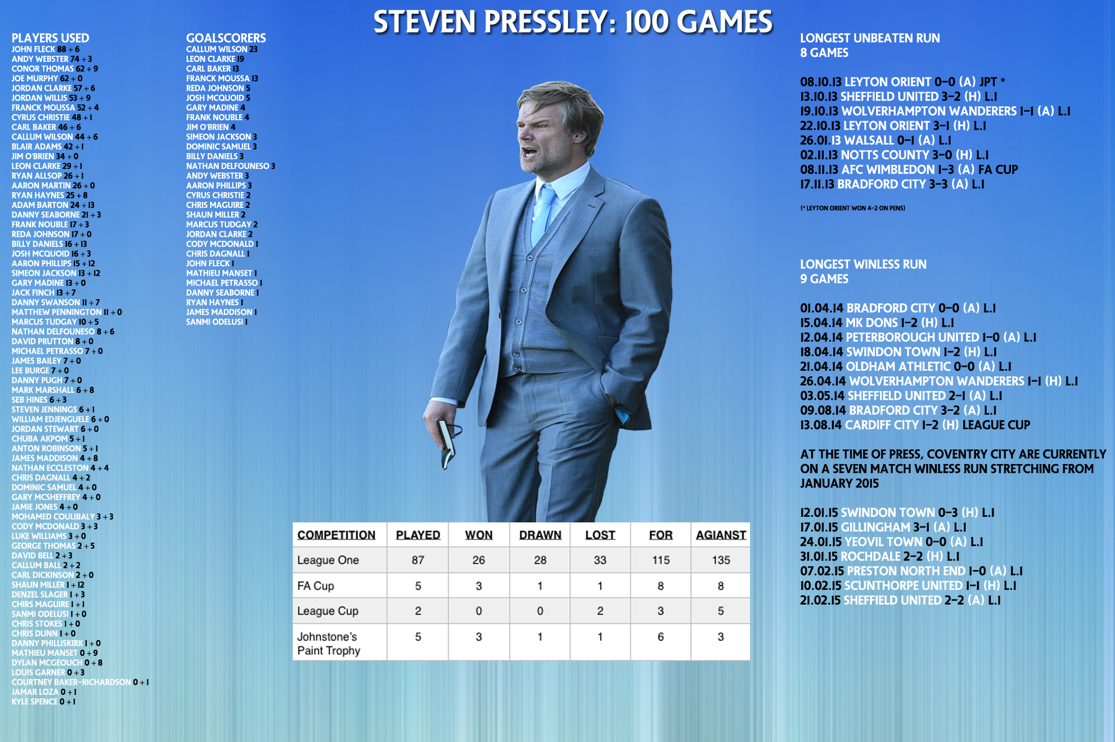 Yesterday afternoon’s 2-2 draw at Sheffield United saw Steven Pressley reach the one-hundred game milestone in charge of Coventry City Football Club.